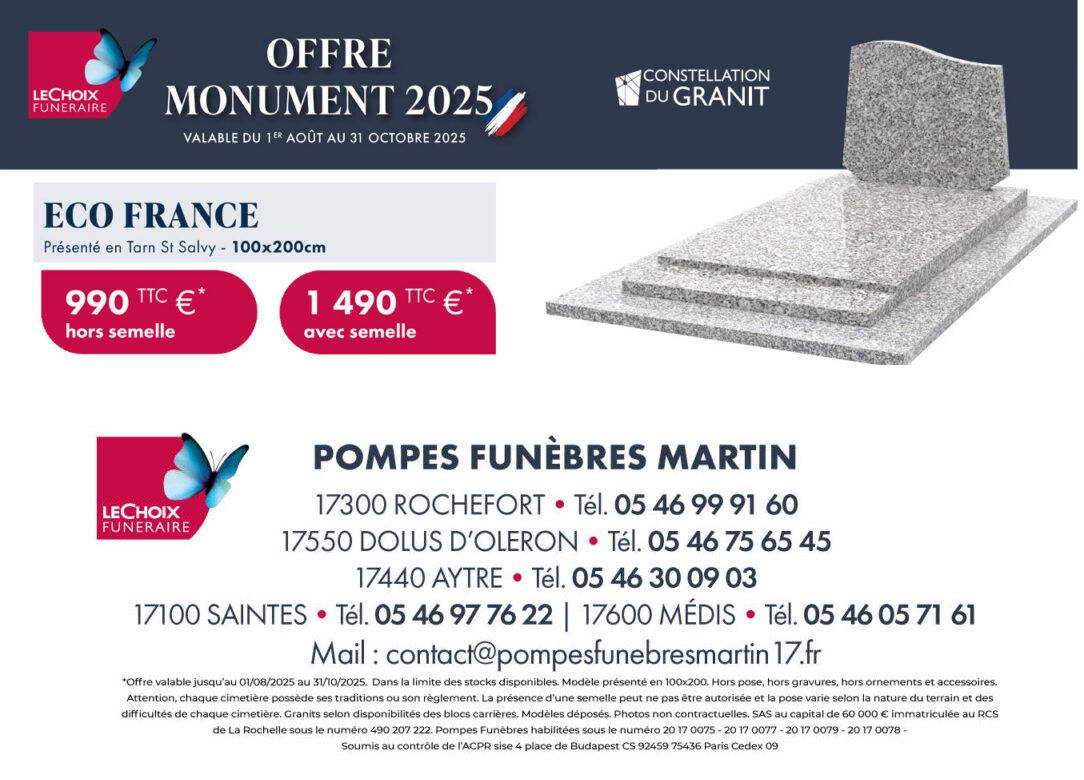 Les POMPES FUNEBRES MARTIN de ROCHEFORT, LA ROCHELLE (AYTRE), SAINTES, MEDIS (ROYAN) et DOLUS D’OLERON sont une entreprise familiale au service des familles depuis plus de 20 ans.